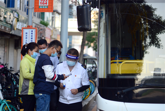 在長客西站264路、103路始發(fā)站,副隊長程玉磊配合公交駕駛員對乘客的健康碼、72小時核酸陰性證明、規(guī)范佩戴口罩、測量體溫等工作進行檢查,廣大乘客主動配合。
