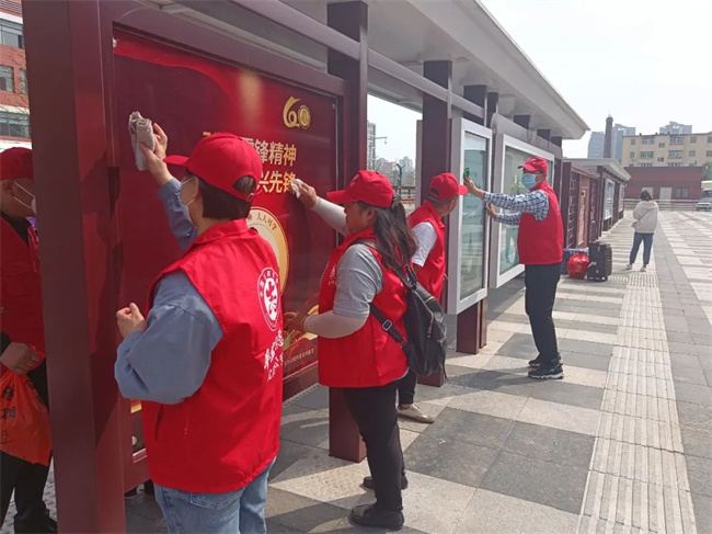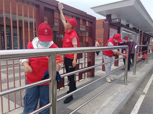 活動(dòng)中,志愿者們身穿紅馬甲、頭戴小紅帽,手中拿著抹布、清潔刷、水桶等清潔工具,對(duì)樞紐站內(nèi)的候車(chē)?yán)?、站臺(tái)等進(jìn)行集中大清掃。