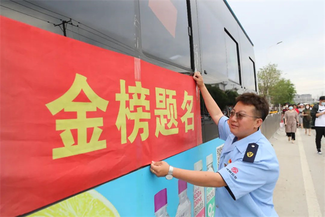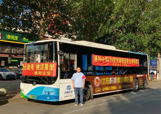 224路駕駛員王樹祥早早來到沈陽建筑大學(xué)附屬中學(xué)校門前,掛起“224車隊(duì)祝高考考生金榜題名”的橫幅,為考生加油鼓勁。