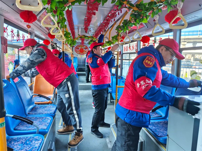 近日,211.222路黨支部全體黨員干部職工在龍之夢公交樞紐站開展清潔運(yùn)營車輛、場區(qū)候車?yán)燃罢緞?wù)室活動(dòng),打造年味公交。