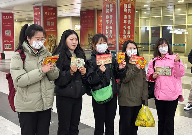 活動(dòng)中,團(tuán)員青年及志愿者在沈陽南站出站口、地鐵口及公交樞紐站服務(wù)臺(tái)向廣大乘客發(fā)放“沈陽最美網(wǎng)紅打卡地圖”DM傳單及暖寶寶。