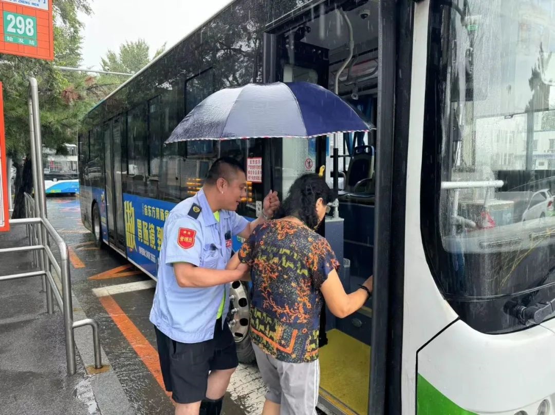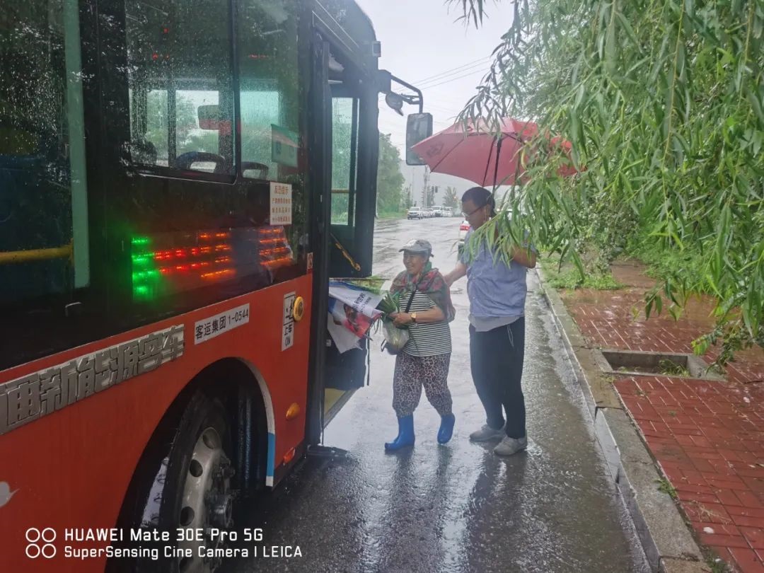 “您好,不要著急,注意腳下路滑,請您小心慢上。”在東望北街公交車站,211路駕駛員周一鳴在雨勢較大時段,來到站點開展志愿服務,在候車亭與上車門之間舉起雨傘,為上下車的乘客架起“愛心走廊”。