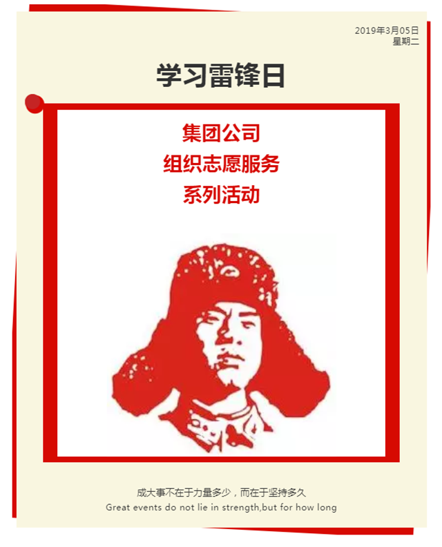 2019年3月5日是第56個學(xué)雷鋒紀(jì)念日,為進一步弘揚“雷鋒精神”,踐行社會主義核心價值觀,不斷激勵和引導(dǎo)集團廣大職工積極向上、樂于助人的服務(wù)理念和奉獻精神,2019年3月5日,集團公司團委組織廣大團員青年開展了學(xué)習(xí)雷鋒精神志愿服務(wù)主題活動。