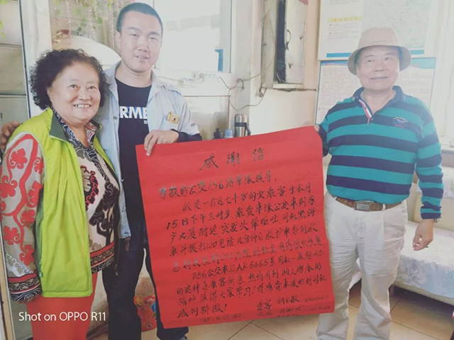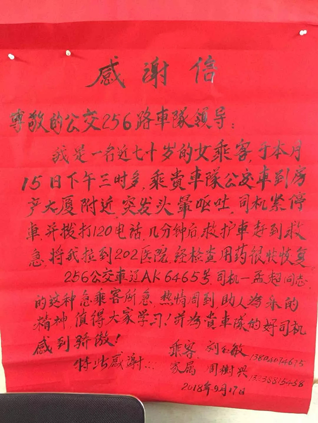 兩天后,老人攜同老伴,將一封寫滿真情的感謝信送到了通利公司256車隊(duì)。老人說(shuō):“當(dāng)天舊疾復(fù)發(fā),非常危急,萬(wàn)幸救護(hù)及時(shí)才沒(méi)有釀成悲劇?!睋?jù)悉,在經(jīng)過(guò)短暫治療后,老人不顧阻攔,堅(jiān)持要親自來(lái)到公交車隊(duì)對(duì)孟超同志表達(dá)感謝,并請(qǐng)求車隊(duì)領(lǐng)導(dǎo)對(duì)孟超這種救死扶傷的高尚品德提出鼓勵(lì)與表?yè)P(yáng)。老人在站務(wù)室等待了近兩個(gè)小時(shí),才將這份真誠(chéng)的謝意親自交到了駕駛員孟超的手上。